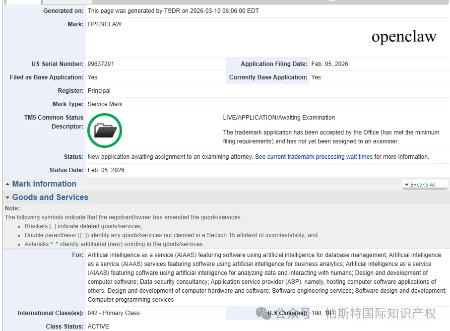 更名后的OpenClaw虽然马上就申请了海外多国的9类和42类商标,但还是在美国申请的时间上栽了跟头。